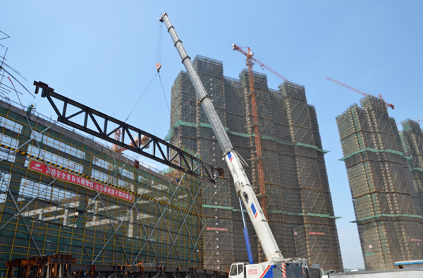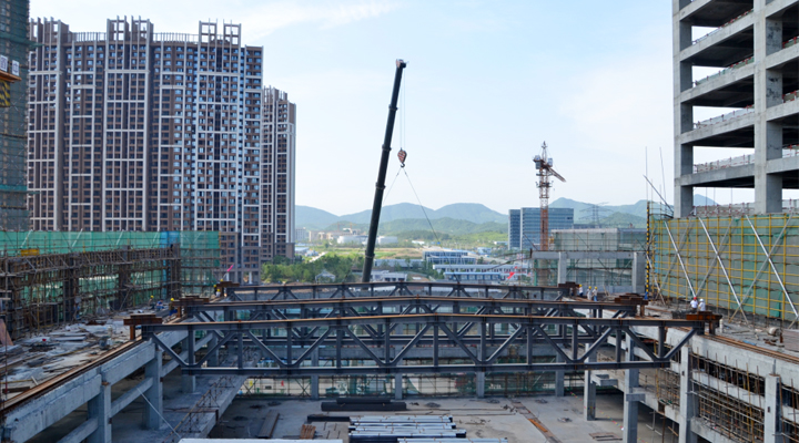On 30th May, a combination of trusses of 100 tons was successfully slipped at high altitude of Qingshan Lake construction site, which is being constructed by Zhejiang HangXiao Steel Structure Co., Ltd.. This combination of truss is used for a banquet hall in hotel podium at A1 area of Yuexiu Urban Complex (phase 1) in Qingshan Lake Science & Technology Park.