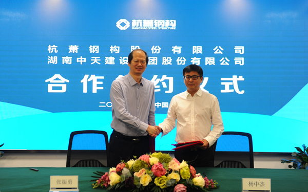 2017年5月31日,杭萧钢构股份有限公司(以下简称:杭萧钢构)与湖南中天建设集团股份有限公司(以下简称:湖南中天)在杭州正式签署战略合作协议。湖南省株洲市荷塘区区委书记邬凌云,区委常委、区委办主任文韶松,副区长陈柏文,湖南中天董事长杨中杰,董事、副总经理闵世雄,常务副总经理谭学文,杭萧钢构总裁张振勇、副总裁兼董事会秘书陈瑞、财务总监许琼、副总裁尹卫泽、副总裁何贤德等出席并见证这一重要时刻。