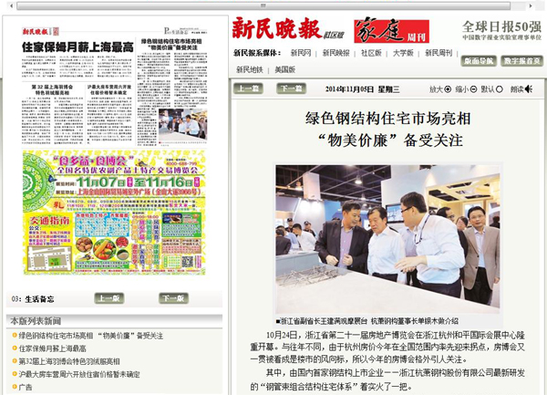 2014年11月5日,《新民晚报》第P03版《生活备忘》报道:《绿色钢结构住宅市场亮相 “物美价廉”备受关注》。