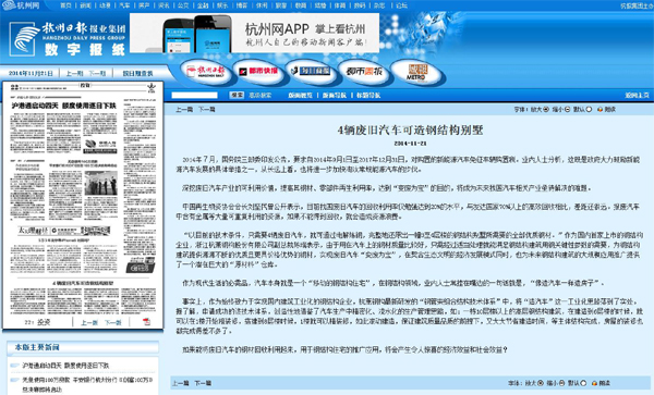 2014年11月21日,《每日商报》第22版《投资》报道:《4辆废旧汽车可造钢结构别墅》。