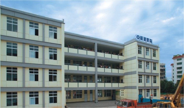 “抗震性能好是钢结构建筑的优点之一。”杭萧钢构总裁助理张德才说,很多城市的公共避难场所的建筑都是采用这种方式建造。10年前,杭萧钢构就在云南、四川等省捐建了4所钢结构建筑学校。比如,采用钢结构建成的四川广元市利州中学教学楼和学生宿舍楼,于2008年9月5日举行奠基仪式,十一月基础动工,2009年三月底开始主体的吊装,七月底竣工,2009年秋季开学投入使用。现在该学校可容纳18个教学班和满足310名学生住宿。另外,2008年12月由杭萧钢构援建的广元市利州中学小学部教学楼——德源楼,占地面积536.7平方米,总建筑面积2146.76平方米。2009年8月30日投入使用,解决了当时530余名学生的开学问题。