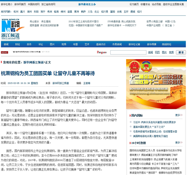 2015年3月5日,《新华网浙江频道》报道:《杭萧钢构为员工团圆买单 让留守儿童不再等待》。