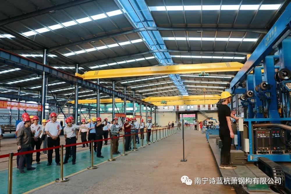 启动仪式剪彩后,广西住房与城乡建设厅、南宁市城乡建设委员会、广西装配式建筑发展促进会、广西建筑科学研究院、广西城乡规划设计院和装配式建筑同行企业的嘉宾们头戴安全帽,有序进入诗蓝杭萧装配式钢结构建筑产业基地,参观设备、机器,在现场专业人员的解说下,了解设备的运转方式。
