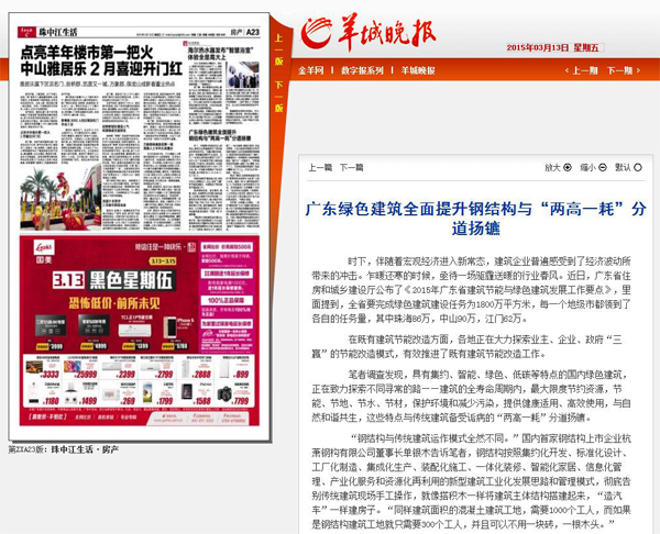 2015年3月13日,《羊城晚报》第A23版《房产》报道:《广东绿色建筑全面提升 钢结构与“两高一耗”分道扬镳》。
