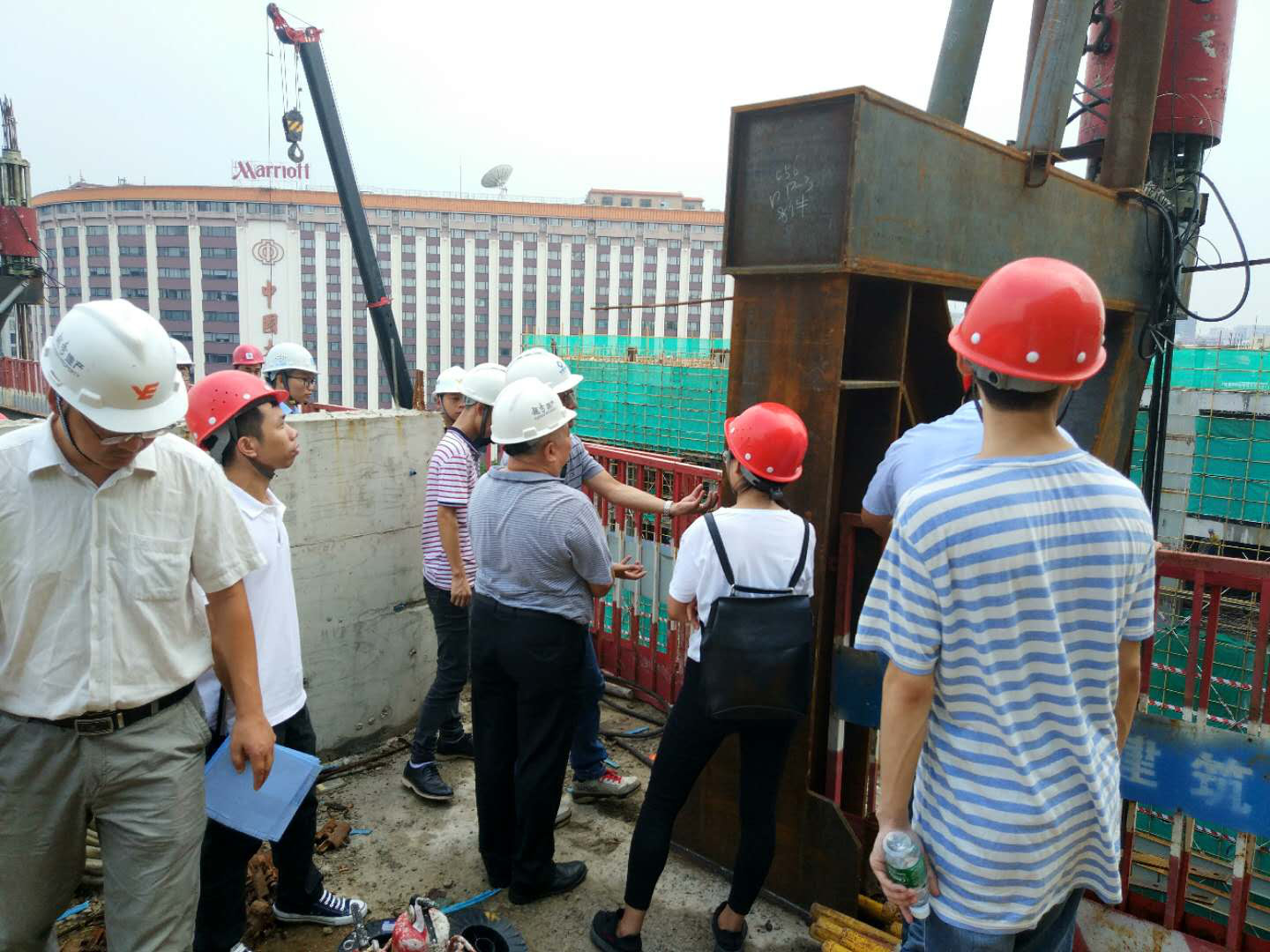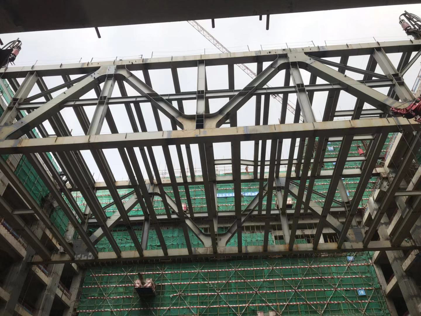 经过广东杭萧技术团队讨论研究后,采取了相应的解决措施:裙房5~7层(H~P轴)桁架跨度为48.9m,矢高12.2m,单榀重量约170T,桁架采用车间预拼装后,散件发到工地,利用汽车吊进行桁架原位拼装,桁架拼装完成后采用“液压提升”技术安装就位。裙房3层(H~P轴)桁架跨度为48.9m,矢高约2.2m,单榀重量约90T,桁架采用车间预拼装后,分段发到工地,采用设置支撑点分段吊装。