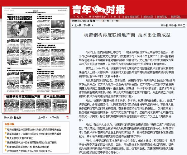 2015年3月23日,《青年时报》第A06版《微杭州》报道:《杭萧钢构再度联姻地产商 技术出让渐成型》。