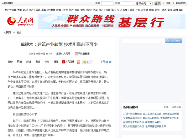 2015年4月10日,《人民网》新闻频道首页报道:《单银木:建筑产业转型 技术引擎必不可少》。