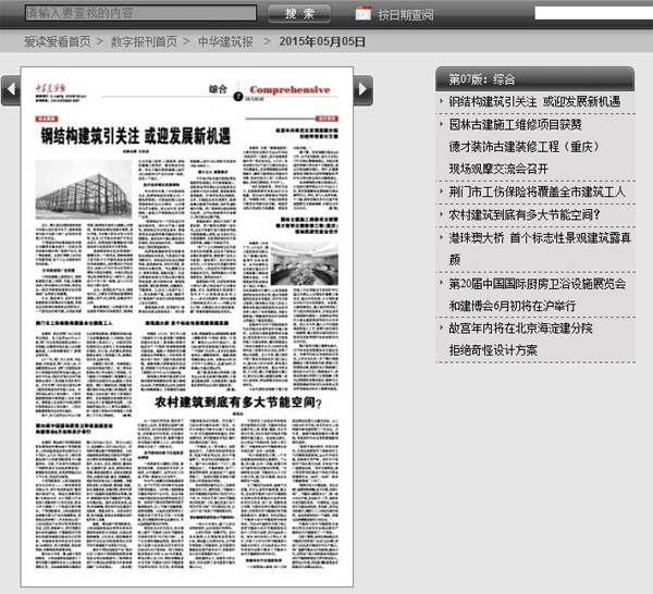 2015年5月5日,《中华建筑报》第07版《综合》报道:《钢结构建筑引关注 或迎发展新机遇》。