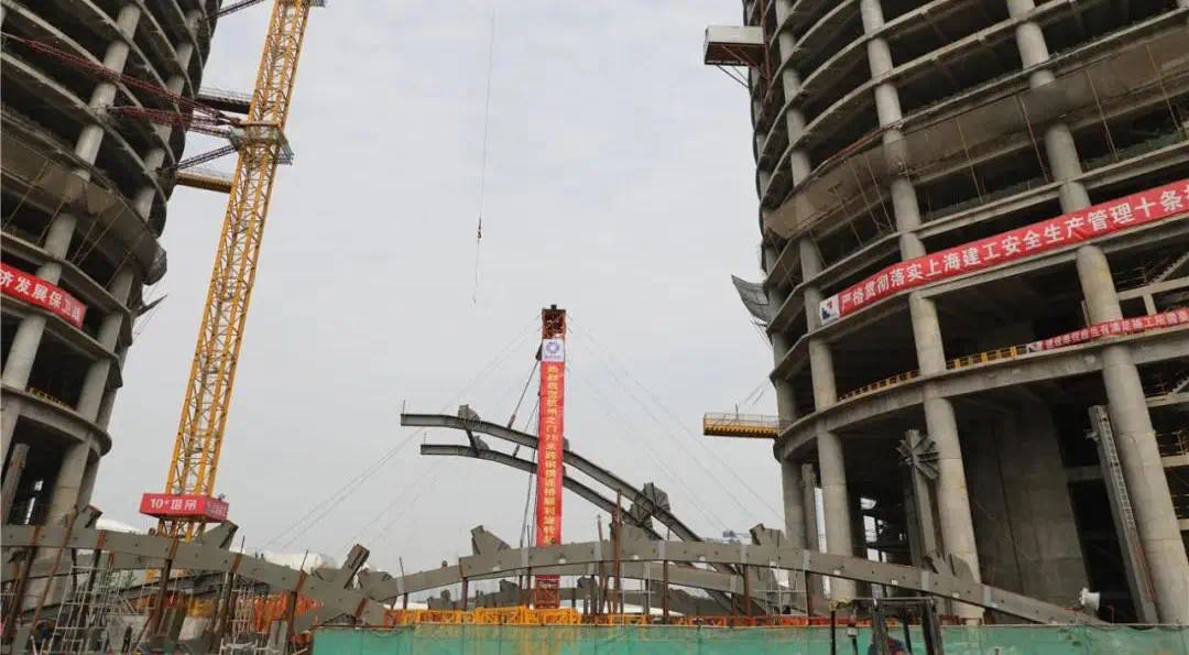 2020年4月22日,由杭萧钢构股份有限公司(以下简称“杭萧钢构”)承建的杭州之门钢结构工程随着TB-C轴、TB-E轴钢拱顺利提升至22米高空,标志着本项目钢拱连桥部位的旋转起扳提升工程正式启动。
