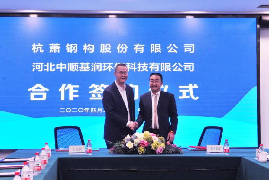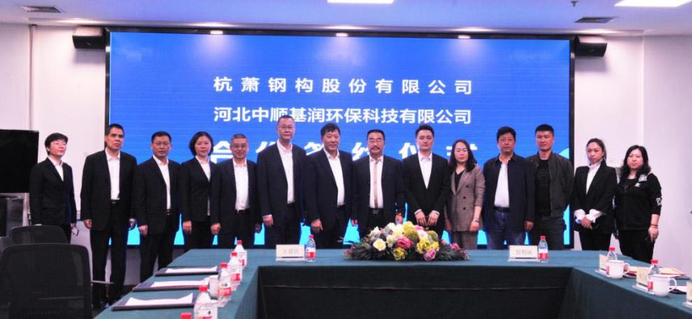 4月26日,杭萧钢构股份有限公司(以下简称“杭萧钢构”)与河北中顺基润环保科技有限公司(以下简称“河北中基环保”)在杭州杭萧钢构集团总部签署战略合作协议。河北中基环保董事长贺利斌、杭萧钢构副总裁王爱民作为企业代表签署协议。