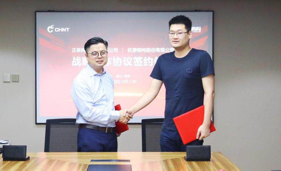 近日,杭萧钢构股份有限公司(以下简称“杭萧钢构”)与正泰网络科技有限公司(以下简称“正泰网络”)签署战略合作协议。正泰网络总经理南君侠、杭萧钢构集团总裁单际华作为企业代表签署协议。