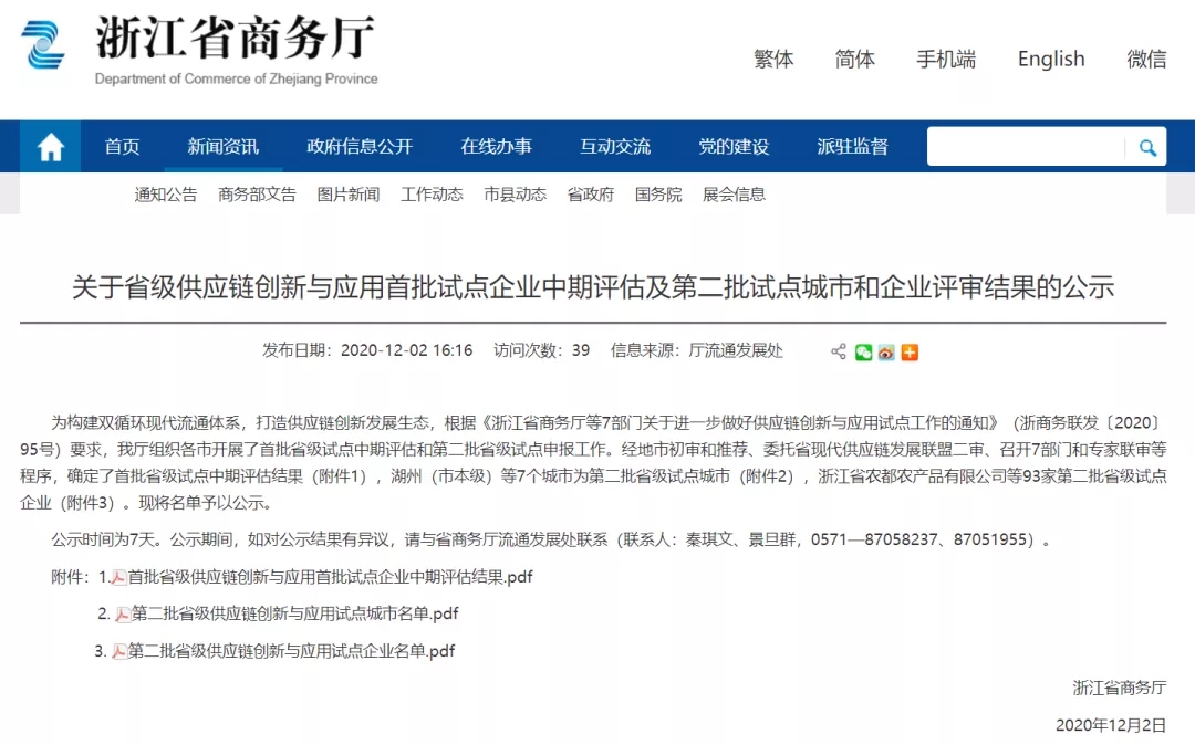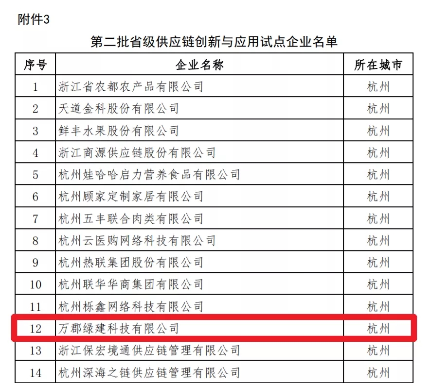12月2日,浙江省商务厅发布《关于省级供应链创新与应用首批试点企业中期评估及第二批试点城市和企业评审结果的公示》,万郡绿建入选浙江省供应链创新与应用试点企业。