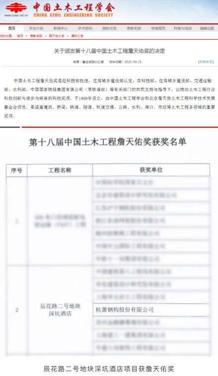 近日,中国土木工程学会公布第十八届中国土木工程詹天佑奖获奖名单,杭萧钢构参建的“辰花路二号地块深坑酒店”项目榜上有名。