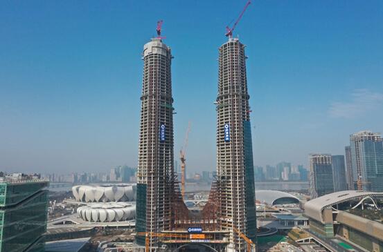 据悉,这座杭州新地标是一座钢结构为主体的双塔楼,杭萧钢构作为唯一一家钢构企业承建该项目主体的钢构工程,负责两栋塔楼的主体钢结构工程、两栋塔楼之间的钢拱连桥及悬垂屋面,以及东、西裙房商业区的钢结构工程。