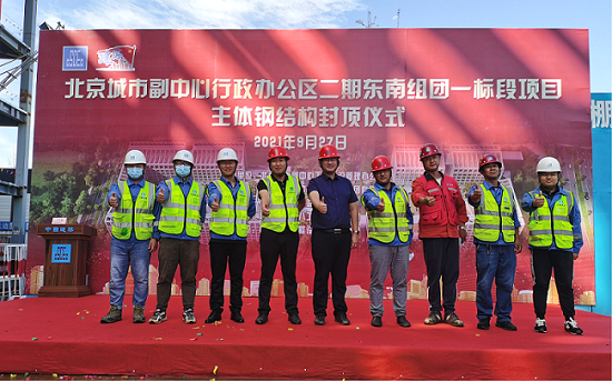 近日,由杭萧钢构(河北)建设有限公司(以下简称“河北杭萧”)承建的北京城市副中心行政办公区二期启动区160&165地块项目前人头攒动、鲜花锦簇,一条条红色横幅装点着建筑主体,总包单位、监理单位、设计单位、建设单位等领导共同见证这一激动人心的封顶时刻。