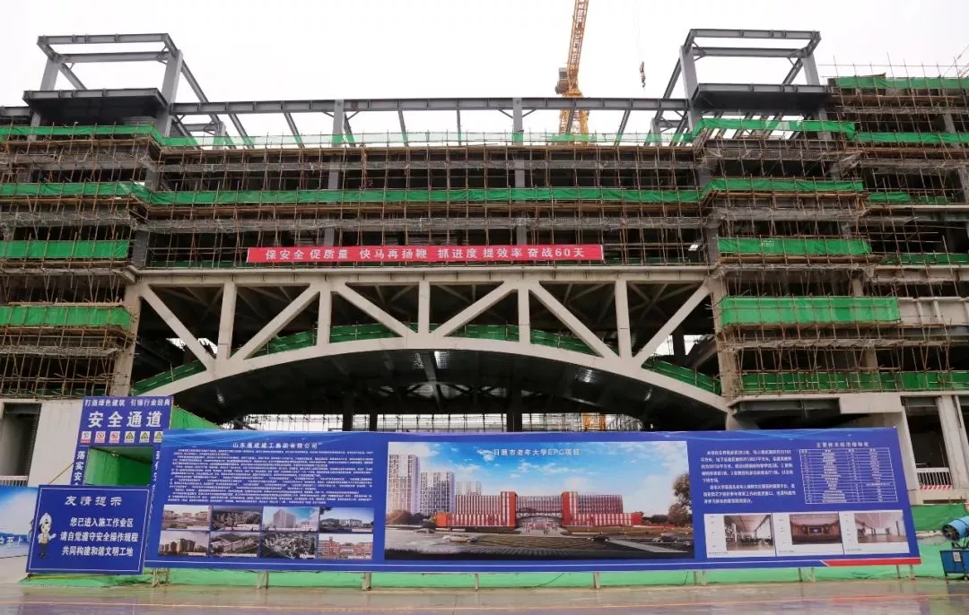 日照市老年大学EPC项目位于山东省日照市,总用地面积28.5亩,总建筑面积3.91万㎡,分为2栋教学楼、1栋体育馆、1栋报告厅三个单体。其中教学楼地下一层,地上6层,房屋高度26.4m,采用钢框架结构;体育馆地上2层,房屋高度12.5m;报告厅地上2层,房屋高度15.4m。该项目于2021年4月开工,同年11月完成结构封顶。