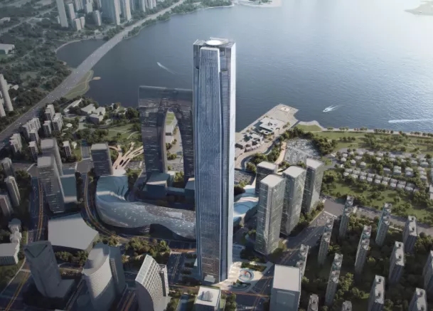 该项目位于江苏省苏州市苏州工业园区金鸡湖畔,楼高499.15m,地上103层,地下6层;塔楼地上部分竖向共分11个区,1-3区为甲级办公区,4区为酒店和公寓式酒店,5-8区为酒店式公寓,9-10区为公寓式酒店;办公标准层层高4.5m,酒店式公寓及公寓式酒店标准层层高4.35m,首层大堂层高15.5m。
