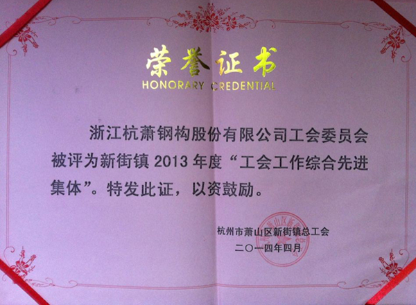 近日,新街镇总工会召开了2013年度工会工作先进集体和先进个人表彰大会,浙江杭萧钢构股份有限公司工会被评为2013年度“工会工作综合先进集体”,职工黄志伟被评为2013年度“优秀职工”称号。