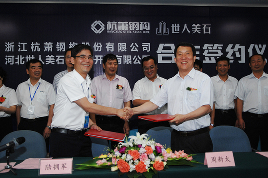 9月9日,浙江杭萧钢构股份有限公司(简称“杭萧钢构”)与河北世人美石房地产开发有限公司(简称“世人美石公司”)钢结构住宅体系(含钢管束住宅组合结构)合作协议签约仪式在杭萧钢构总部瑞丰国际商务大厦举行。杭萧钢构董事长单银木、世人美石公司董事长周新太、河北省邯郸市涉县县委书记李书生、副县长路正阳等领导参加了签约仪式。