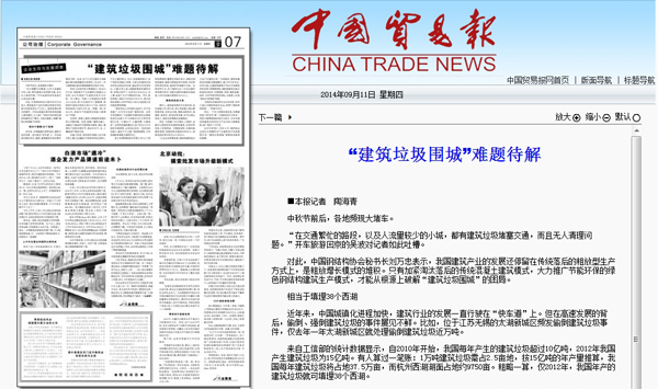 2014年9月11日,《中国贸易报》第07版《公司治理》报道:《“建筑垃圾围城”难题待解》
