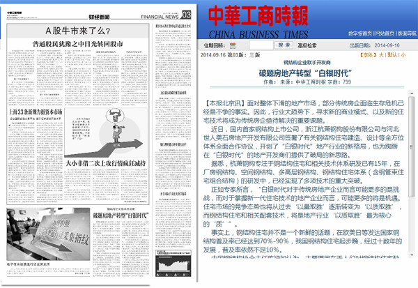 2014年9月16日,《中华工商时报》第03版《财经新闻》报道:《破题房地产转型“白银时代”》。