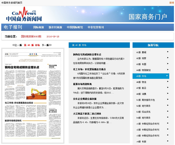 2014年9月18日,《国际商报》第A5版《市场》,版面头条报道:《钢构住宅将成钢铁业增长点》。