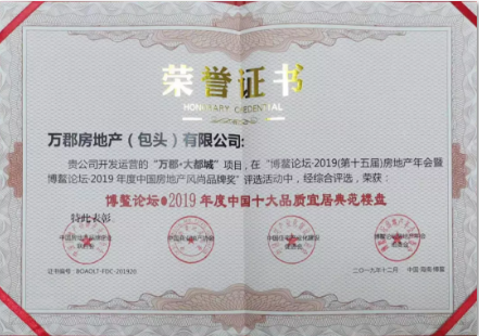 博鳌论坛·2019年度中国十大品质宜居典范楼盘荣誉证书