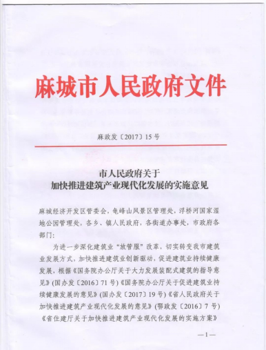 推进建筑产业现代化,大力发展钢结构和装配式建筑,是党中央、国务院作出的重大决策,麻城市政府根据国务院和相关部委、湖北省政府的产业政策,于2017年9月出台了《关于加快推进建筑产业现代化的实施意见》的文件,对于麻城市建筑产业结构升级、建筑产业现代化的发展作出了明确部署和要求,确定以城区为龙头,以政府投资项目为重点,以装配式建筑技术作为主要实现形式,支持企业投资建设建筑产业现代化基地,开展建筑产业现代化项目应用试点。