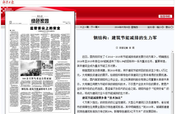 2014年7月3日,《科技日报》第12版《绿色家园》报道:《钢结构:建筑节能减排的生力军》。