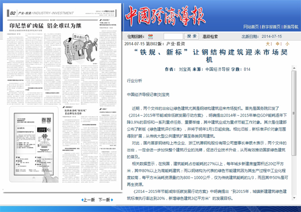 2014年7月15日,《中国经济导报》第B02版《产业·投资》报道:《“铁规、新标”让钢结构建筑迎来市场契机》。