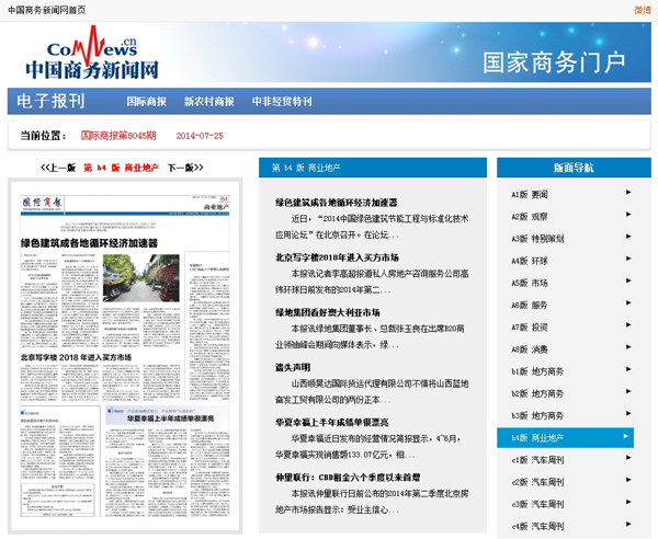 2014年7月24日,《国际商报》B4版《商业地产》报道:《绿色建筑成各地循环经济加速器》。