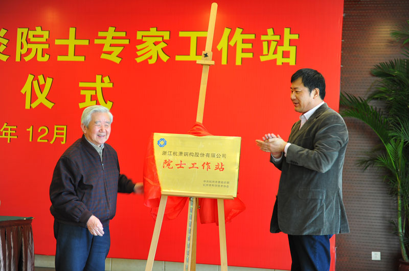 12月3日,沈祖炎院士(左)同杭萧钢构董事长单银木为杭萧钢构院士工作站揭牌