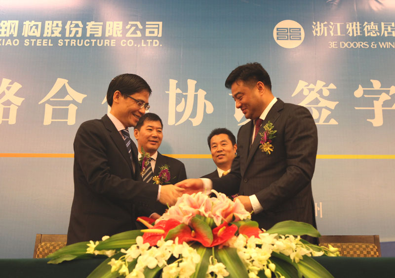 新华网浙江频道10月28日电(记者李亚彪 赵生祥)28日,浙江杭萧钢构股份有限公司(以下称“杭萧钢构”)与浙江雅德居节能环保门窗有限公司(以下称“雅德居”)签署战略合作协议,双方商定在地产板块方面的专业合作开发和投资建设、外围护部品(件)体系等方面加强合作,成立战略联盟,携手推进绿色建筑、建筑节能进程。