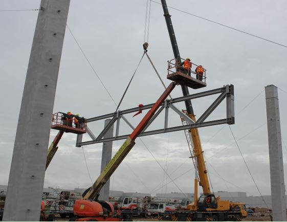 7月2日上午9点18分,华晨宝马汽车三期厂房工程顺利完成首根桁架的吊装,标志着由浙江杭萧钢构股份有限公司(以下简称杭萧钢构)制作、安装的该项目开始进入地上钢结构施工阶段。该工程预计2013年9月底完成主体结构施工。华晨宝马汽车总经理、副总经理、华晨宝马汽车项目经理、中八局大连公司总经理、彪马管理公司经理、监理总监及我司工程系统王(生宏)总监、营销系统毛(建辉)经理、质管部徐(兵)经理参加了本次首吊仪式。杭萧钢构工程系统总监王生宏致辞并承诺严格按照甲方、总包、管理公司及监理单位要求安全文明施工,确保工程安全、质量和工期。杭萧钢构项目部项目经理叶建国代表现场所有管理人员进行宣誓保证在整个项目施工中按照施工组织设计、各个方案交底施工,圆满的把整个项目交付给业主。宝马汽车公司及中八局对我司给予高度信任及肯定,相信会很愉快的把这个项目做好。在公司指导及大力支持下,整个项目部团队将密切协作带领现场施工人员一起努力共同战斗定会取得一个圆满结果。