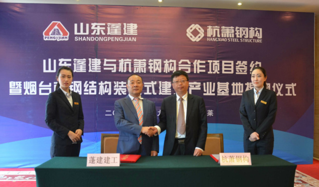4月9日,杭萧钢构股份有限公司与山东蓬建建工集团有限公司(以下简称“山东蓬建”)战略合作签约暨烟台市钢结构装配式建筑产业基地揭牌仪式在山东省蓬莱市国宾楼举办。山东省烟台市住房和城乡建设局局长季善亭、副局长吕春松、蓬莱市政府市长杨升岩、副市长张祖玲等领导亲临,一同见证山东蓬建与杭萧钢构的战略合作签约,以及烟台首个“钢结构装配式建筑产业基地”的授牌和揭牌仪式。