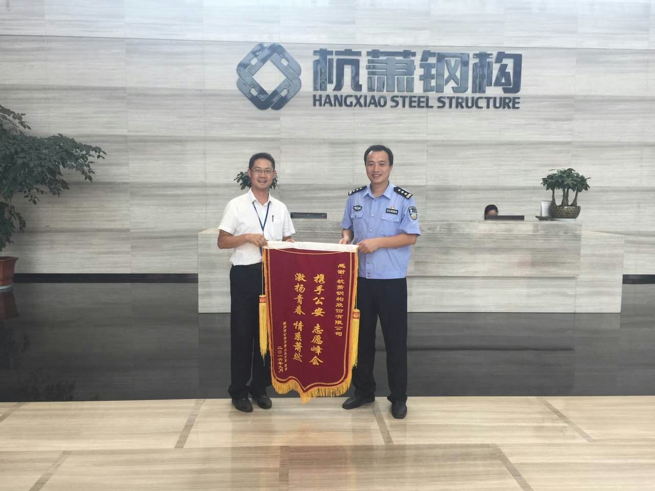 9月12日,杭州市公安局萧山分局沈秋羊副局长一行专程来到杭萧钢构股份有限公司,为杭萧钢构在8月28日至9月7日杭州G20峰会期间,派驻40名骨干员工及民兵人员志愿支援峰会安保的工作,送来感谢信及感谢锦旗,锦旗上写着“携手公安、支援峰会,激扬青春、情系萧然”的感谢词。