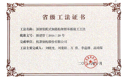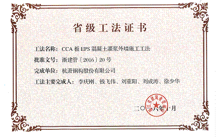 近日,杭萧钢构早前申报的“预制装配式CCA板EPS轻质混凝土条板墙施工工法、CCA板EPS混凝土灌桨外墙施工工法、预制装配式钢筋桁架楼板施工工法”三项工法正式被评为浙江省2015年度省级工法。这为申报国家级工法奠定了良好的基础。
